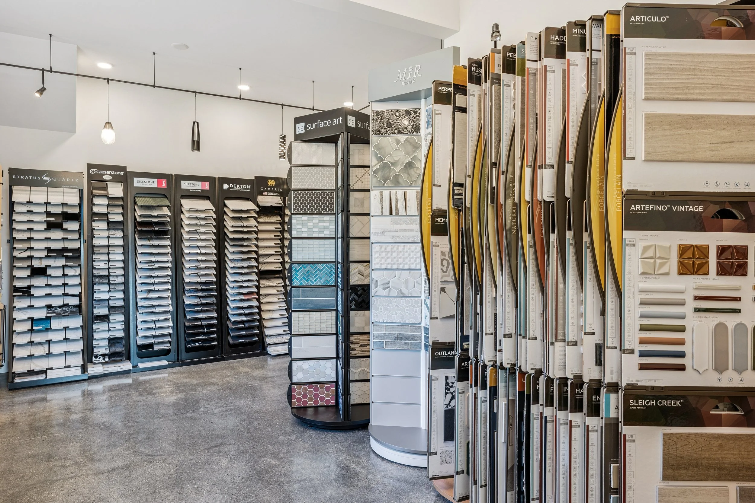 Bellmont shaker-style cabinets in a playful Moab paint, paired with a sleek 2 cm Dekton Laurent countertop, bring a vibrant touch to the space. This display highlights smart interior roll-out cabinet options, an office pencil drawer for added convenience, and a recessed toe kick on all sides.