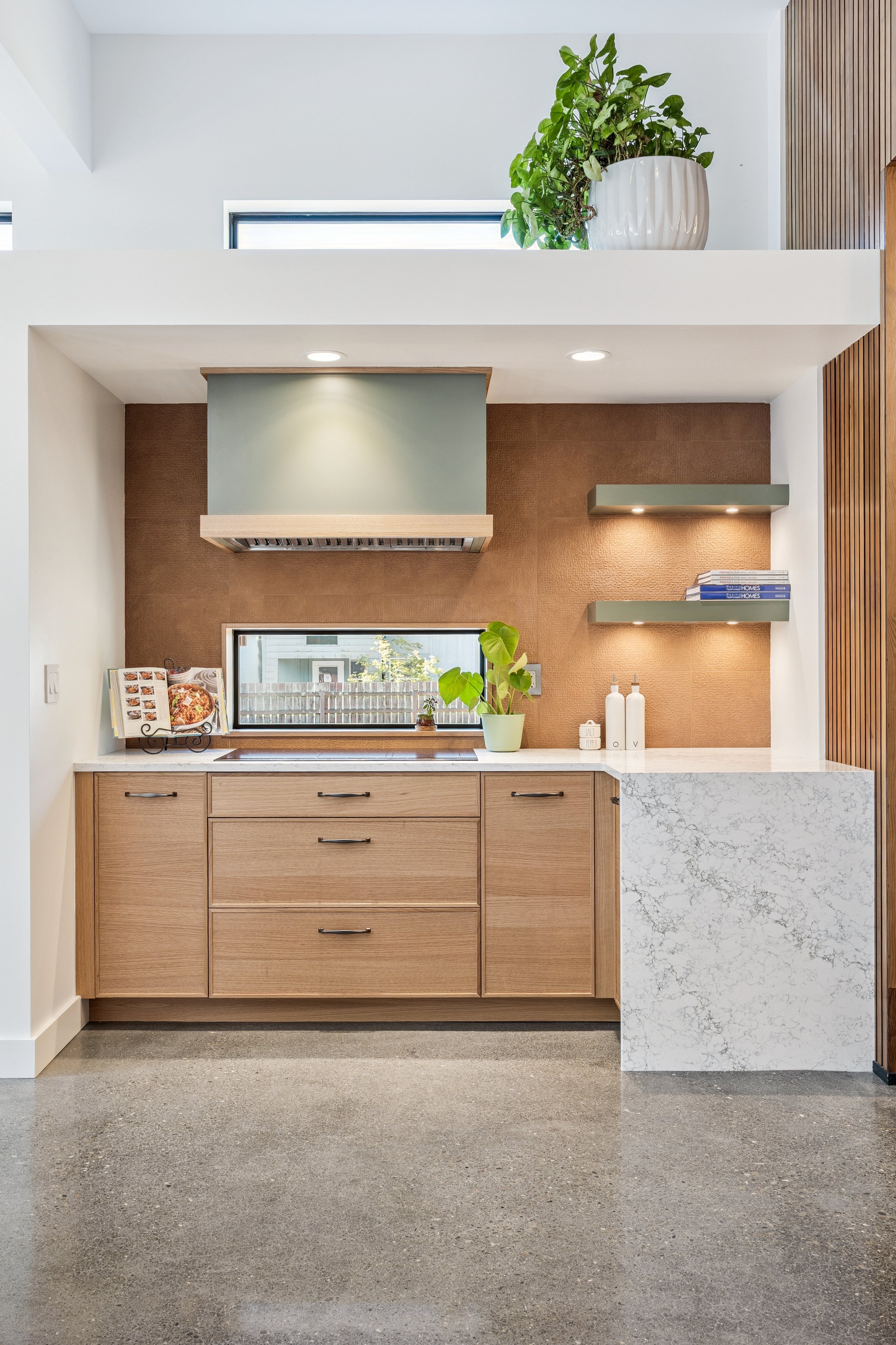The modern thin shaker-style cabinetry in rift white natural oak, paired with a Saguaro-painted hood and floating shelves, creates a sleek and contemporary aesthetic. This vignette showcases an induction cooktop, convenient cabinet pullouts, and thoughtfully designed storage accessories. A full-height textured backsplash adds depth and modern sophistication to the space.