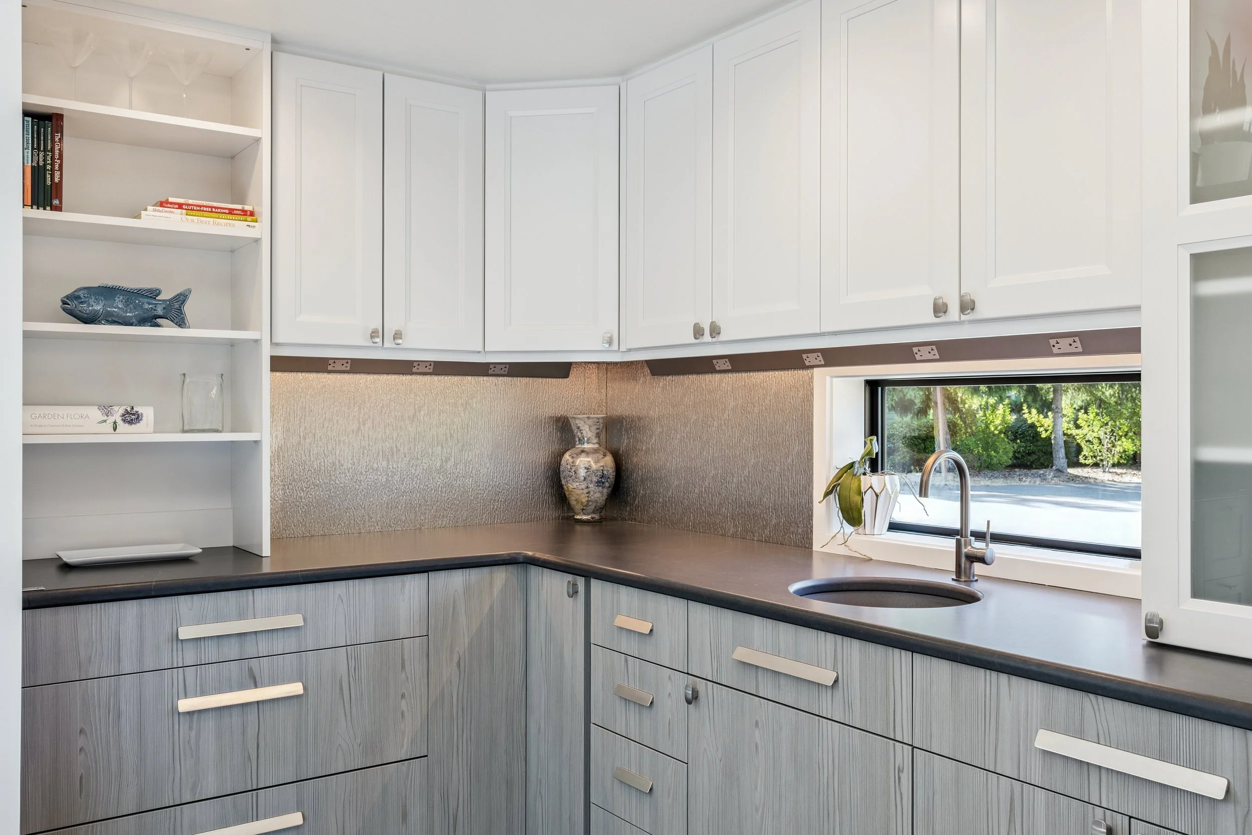 A timeless white upper cabinetry combined with textured melamine base cabinets creates a modern, sophisticated look. This vignette highlights various features, including elegant glass cabinets, open countertop shelving, a super Susan for optimal storage, a versatile peg board drawer system, and multiple drawer insert options.