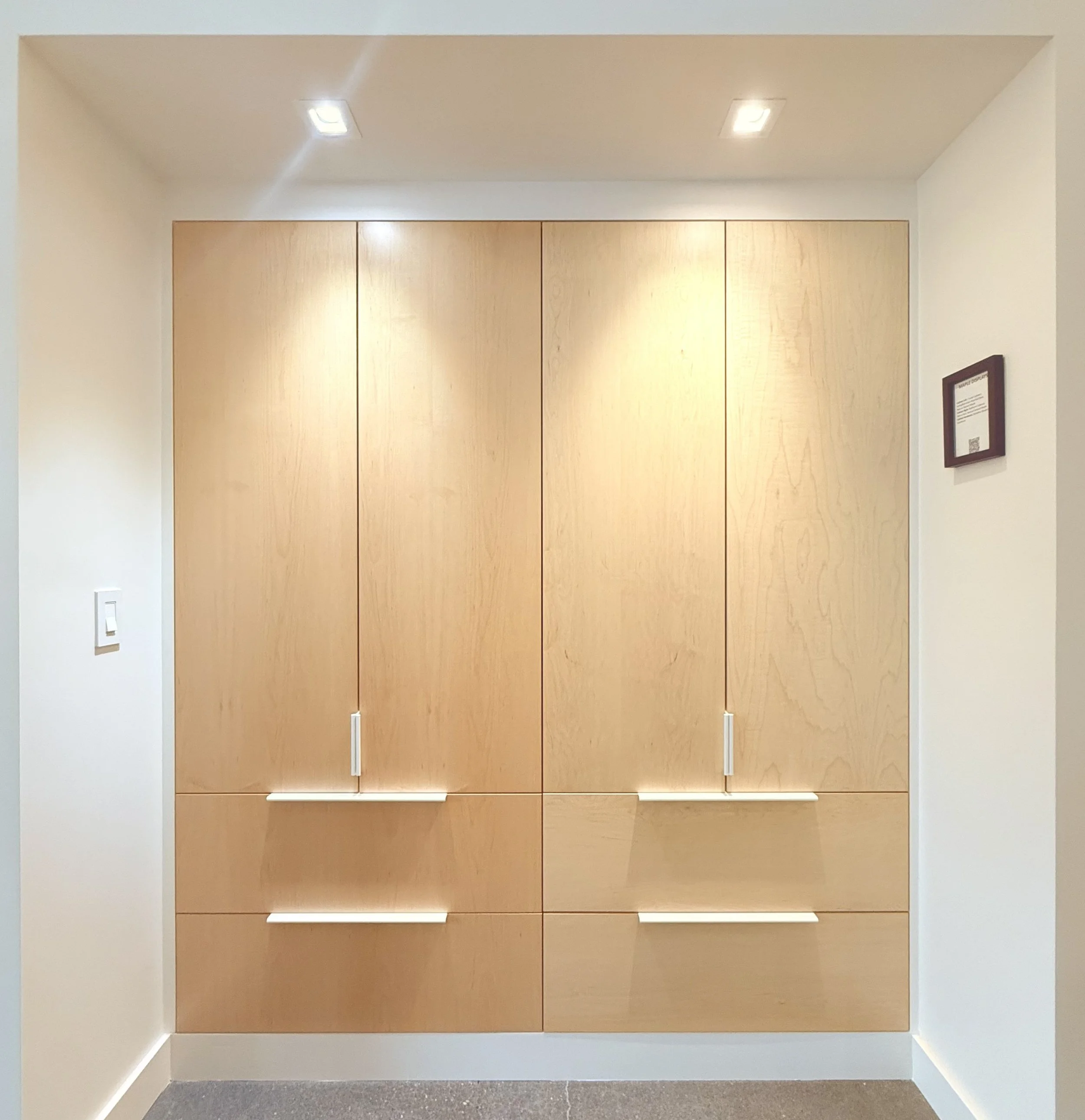 Tall cabinets finished in a natural maple stain, complete with sleek drawers, offer both warmth and functionality. Thoughtfully trimmed for a refined, built-in aesthetic, they bring an elegant and timeless appeal to the space.